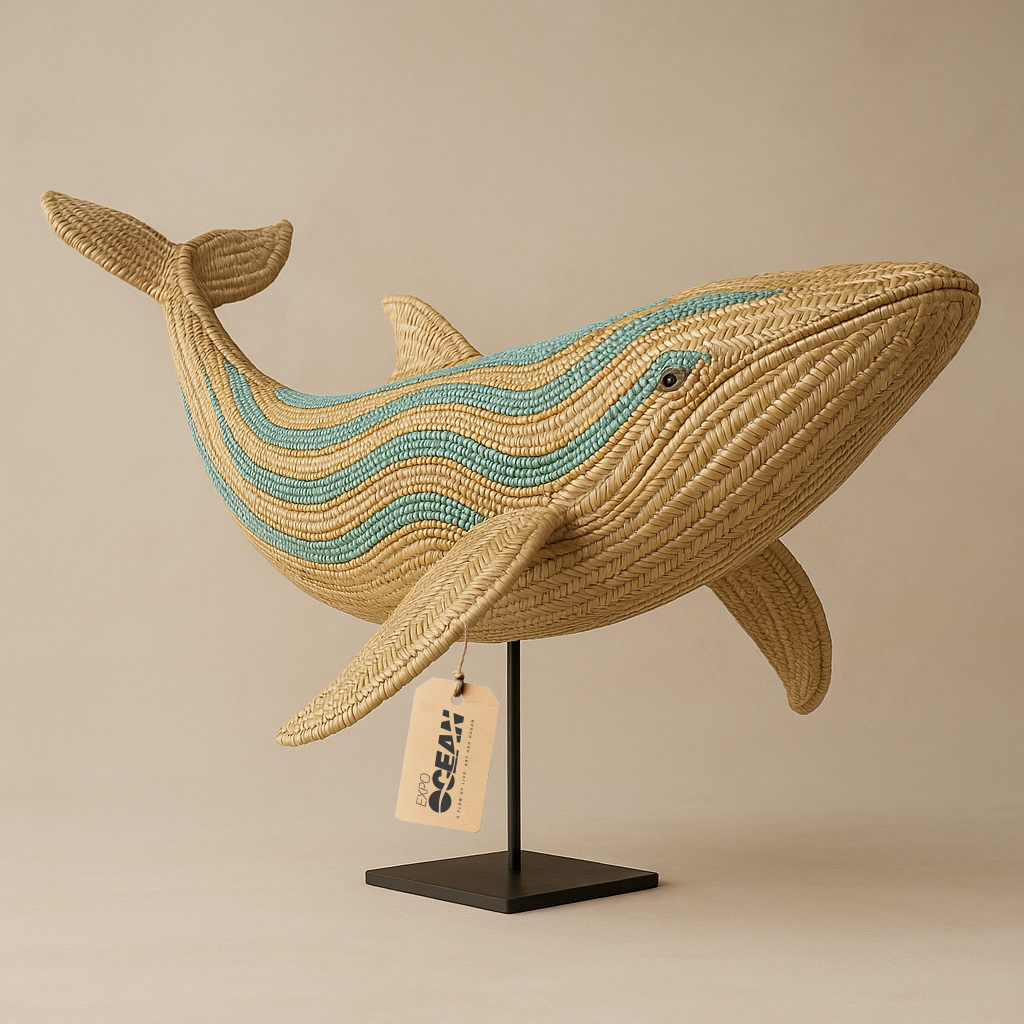 As esculturas monumentais, criadas em palha trançada e missangas, representam espécies marinhas e costeiras, símbolos da biodiversidade e da urgência de preservação.